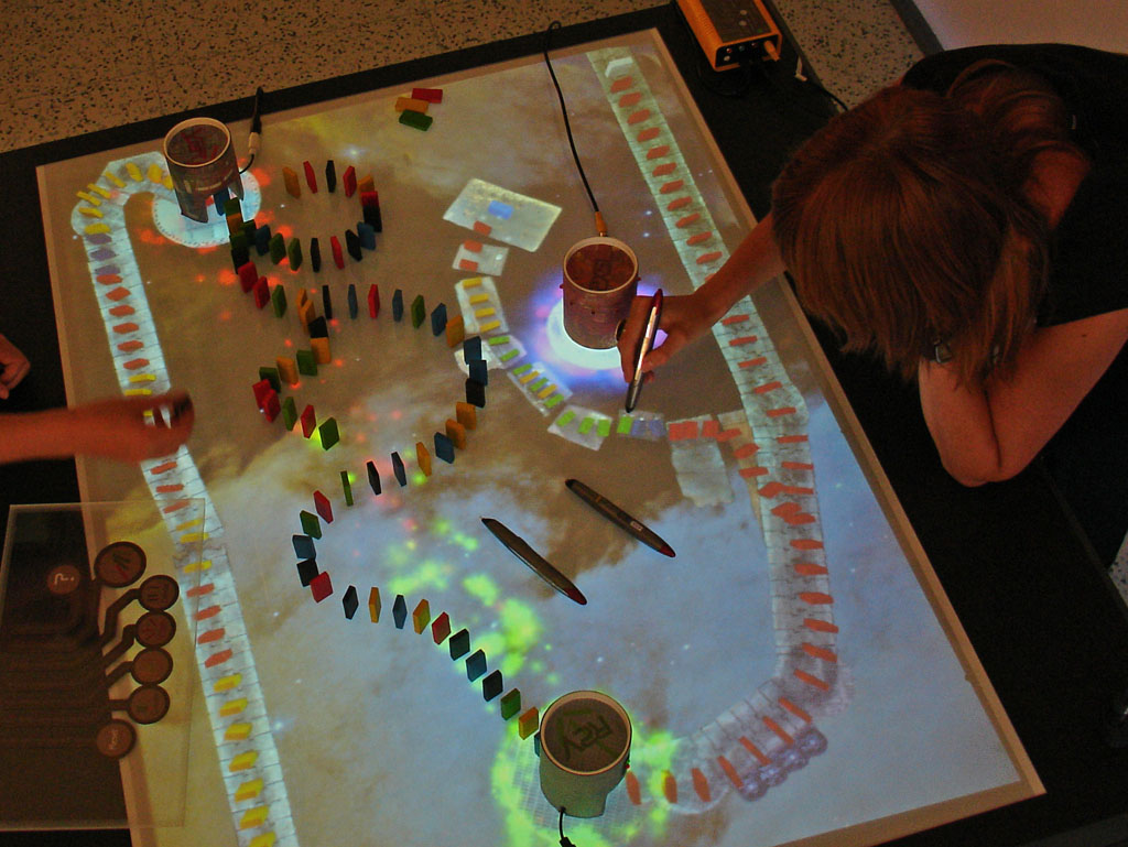 ステムは、専用テーブルとデジタルペン(Anoto)、フィジカルゲームコンポーネントで構成されます。まず、ゲームが開始されると画像のようなインストラクションステージからスタートします。デジタルペンでテーブルトップをなぞるとヴァーチャルドミノが生成され、グラウンドに沿ってドミノを配置していきます。