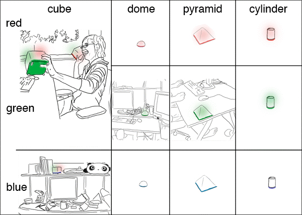 nimioは,単体の遊具であると同時にネットワークで接続された一連のタンジブルオブジェクトで構成されるシステムであり,分散環境におけるアクティビティ視覚化のためのインプット/アウトププット機能を持つ.nimioのシステムは,12の透明なシリコン遊具で構成されている.単一のnimioは形状と色で定義される.形状は,ピラミッド,キューブ,ドーム,シリンダの4種類あり,色は赤,緑,青の3種類である.初期状態では,赤,緑,青いずれかを発光している.また,これら2つの属性は,2つのfamily group – shape groupとcolor group – として機能する.